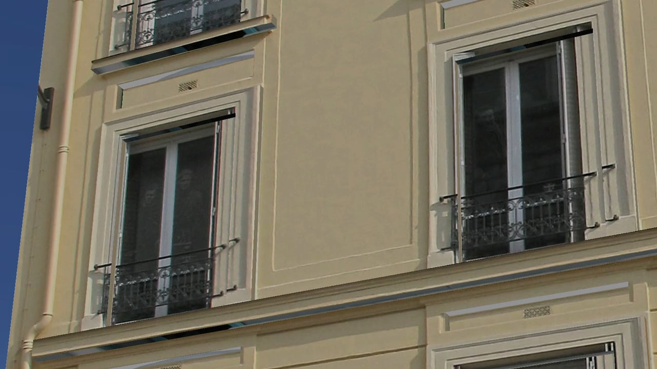Facade Rue Lafayette 120. Modified with posters of that time calling for the recruitment of brigadiers and with images of brigadiers that, like ghosts from the past, seem to inhabit the interior of the building, bringing together the past and the present.